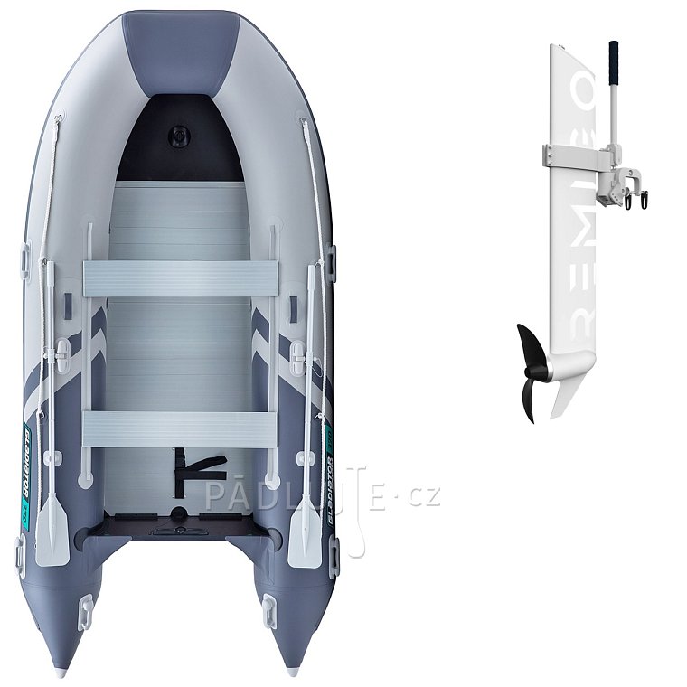 Skvělý nafukovací člun GLADIATOR C370AL s hliníkovou podlahou jsme osadili elektrickým závěsným motorem REMIGO s výkonem 1,0kW, tedy 3HP. Člun je určen pro max 5 osob. Testovali jsme ho s 2-členou posádkou i plně naložený 5-ti dospělými a jedním dítětem.