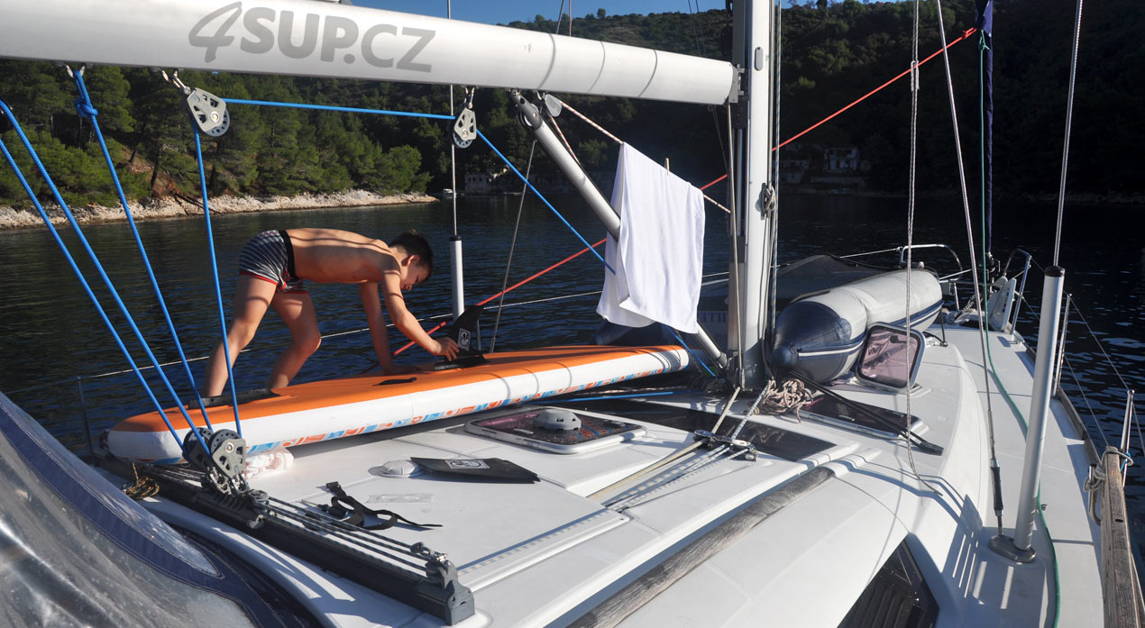Nafouknutý plovák lze také přepravovat přímo na palubě. Nám se osvědčilo přivázat paddle k zábradlíčku v zadní části lodě, tak aby nevadil plně napnuté geně a její otěži. Za silnějšího větru však doporučuji paddleboard sbalit.