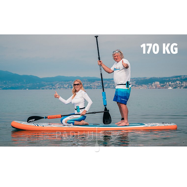 Zde testujeme paddlebord AQUA MARINA PURE AIR 12' - výrobce uvádí maximální zatížení 170 kg - pokud se na plováku váha rozloží do více bodů - zde dva jezdci v součtu 130 kg, je vše v pořádku.