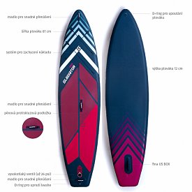 Plovák má výšku 12 cm, šířku 81 cm a délku 347 cm. Výtlak 285 litrů a váhu pouhých 10,5 kg. Jde o všestranný nafukovací paddleboard (SUP), vyrobený dvojvrstvou FUSION DROP-STITCH technologií. Jeho velkou výhodou je, že po jízdě jej sbalíte do úhledného balíčku.